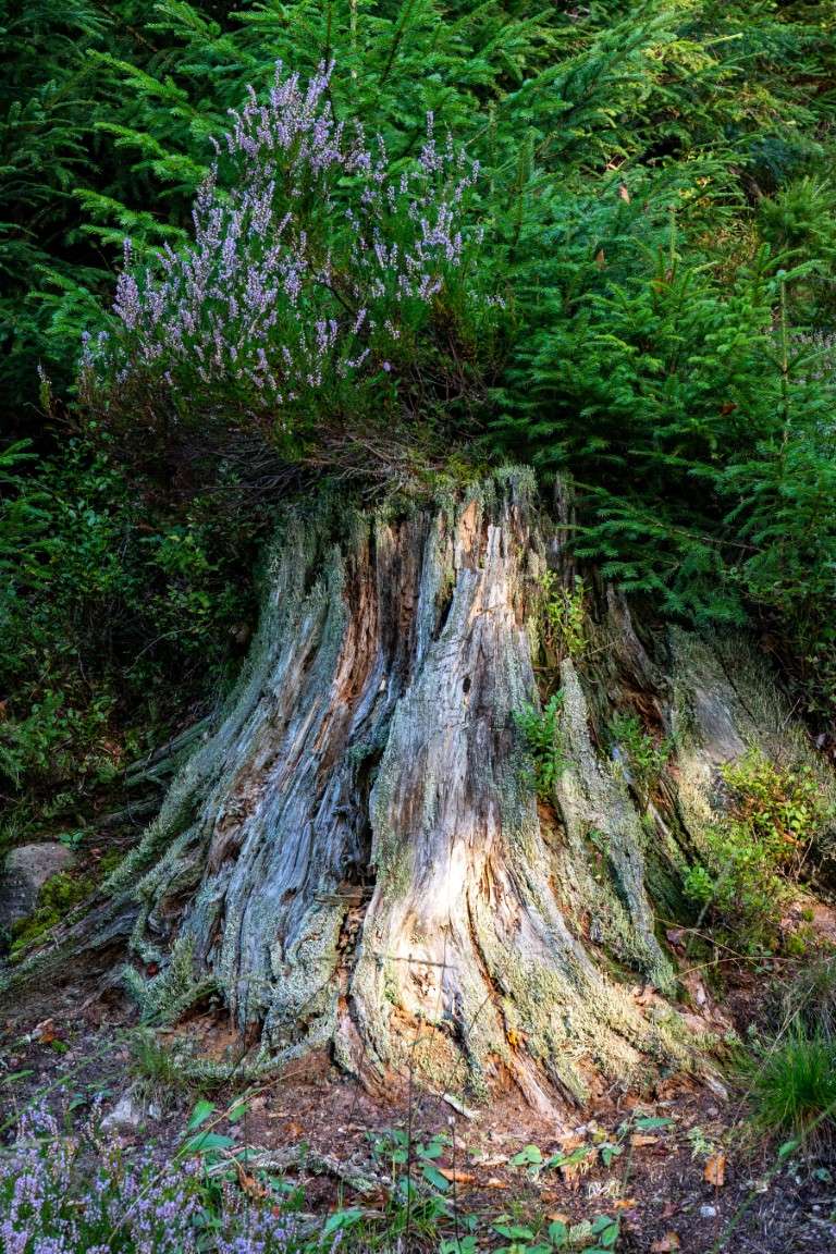 Auf dem alten Baumstumpf hat sich eine Kolonie blühender Blumen angesiedelt.