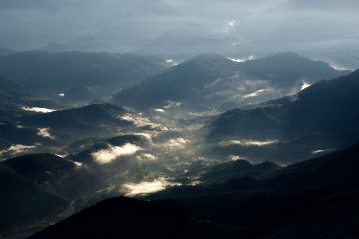 Frühmorgens atmet die Provence die Nässe der Nacht in malerischem Nebel aus. Aufnahme vom Mont Ventoux aus. Dafür hat sich die kalte und stürmische Nacht auf dem Berg gelohnt.