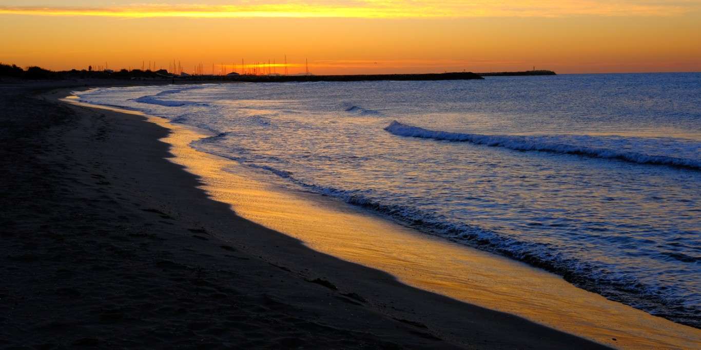 Wandbild Panorama | Sonnenuntergang in Sainte Maries de la Mer (Camargue)